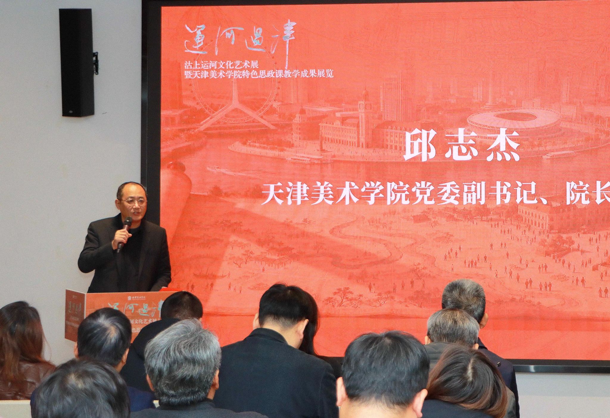 开幕式上,天津美术学院党委副书记、院长邱志杰发表致辞。他指出,大运河作为中华民族的文化瑰宝,见证了天津“因河而生、因漕而兴” 的发展历程,孕育了独特的城市文化底蕴。本次“运河过津”系列艺术思政项目,以“七个一”系列活动为载体,联动全市大中小学共同参与,活动开展以来得到了社会各界的高度赞誉和认可,著名文化大家冯骥才亲自为活动题词,是学校深入贯彻落实习近平总书记关于大运河文化保护传承利用的重要指示批示精神的具体实践。邱志杰强调,天津美术学院将持续肩负文化传承使命,以艺术为桥、以思政为魂,深化运河城市大中小学思政一体化建设,让中华优秀传统文化在新时代焕发新生。