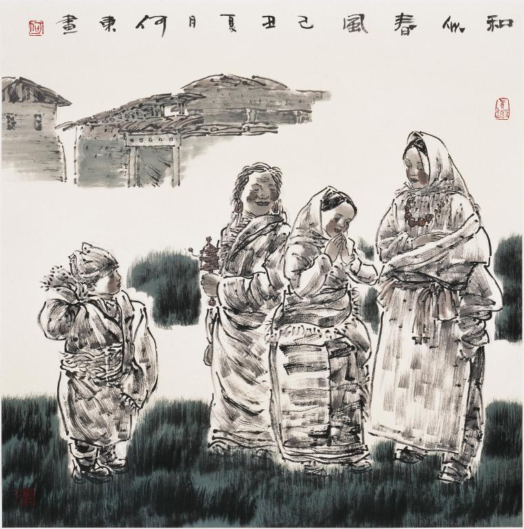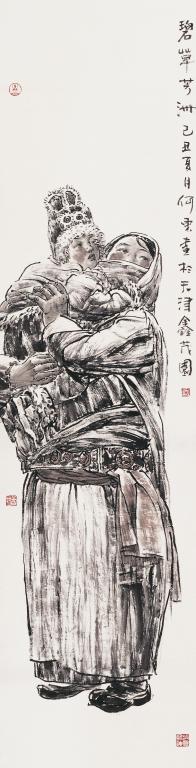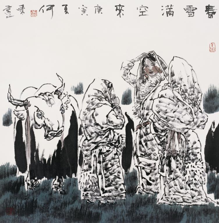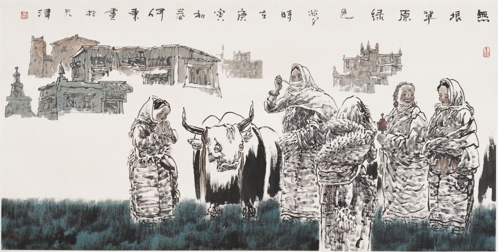十几年来曾多次深入到藏区,去感受雪域高原纯朴的民风,从而绿色高原系列作品应运而生。运用扎实的速写功底和敏锐的观察力,通过灵动而富有魅力的水墨线条,结合焦墨大胆地皴擦,并衬托醒目的绿色,与色墨的交融中,再现了心灵中藏民的形象、情感和梦想。