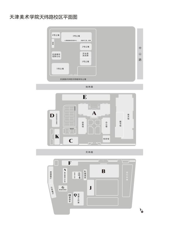 天津美术学院天纬路校区 地址:天津市河北区天纬路四号 邮编:300141 校区代码:1 1. 教学科研区域:a楼、b楼、c楼(5-6层)、d楼(一层 造型基础写生基地)、e楼、f楼、g楼、h楼、j楼、l楼、m楼、n楼、q楼 2. 办公区域:办公楼、d楼(二层)、k楼(一层) 3. 学生公寓: 天津美术学院天纬路学生公寓(c楼1-4层,k楼2-3层) 天津美术学院志成路学生公寓 4. 餐厅:崇德餐厅(教职工)力学餐厅(学生) 5. 其他区域:图书馆、美术馆、体育馆、网球场、篮球场、校史馆